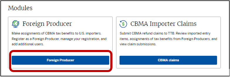 Foreign producers seeking to assign CBMA tax benefits must register online through myTTB in order to receive a TTB Foreign Producer ID and assign tax benefits to a U.S. importer. In order to complete the registration process, the foreign producer (or their agent, see FAQ FP-4) will need to enter the following information, in the English language, through myTTB.