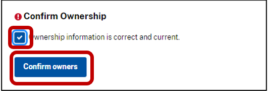 2a. If ownership information is correct and no changes are needed, scroll down to the Confirm Ownership section. Read the statement next to the check box and select the box to agree to the statement. Select Confirm owners.