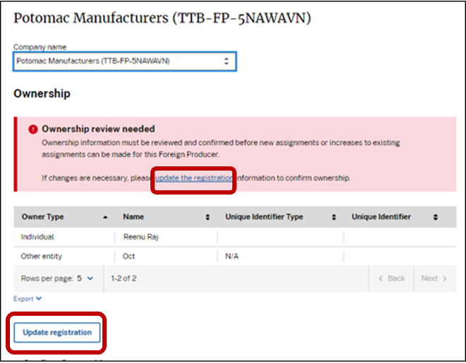 Foreign producers who register with TTB are required to update their registration within 60 days of any change to the information that was required as part of the original registration. In addition, every year, the myTTB system will prompt the foreign producer to either confirm or update the ownership information on file with their registration. If the foreign producer fails to confirm or update its registration information, the foreign producer will not be able to assign CBMA tax benefits until the required action is completed.